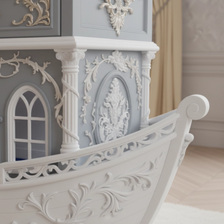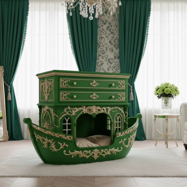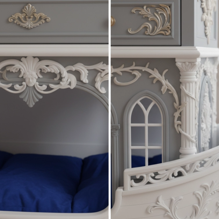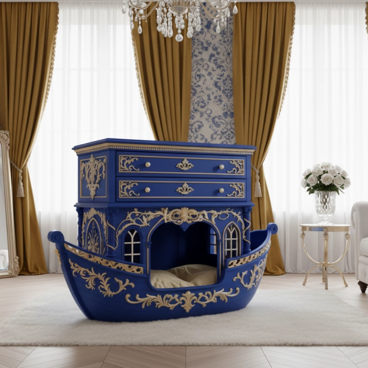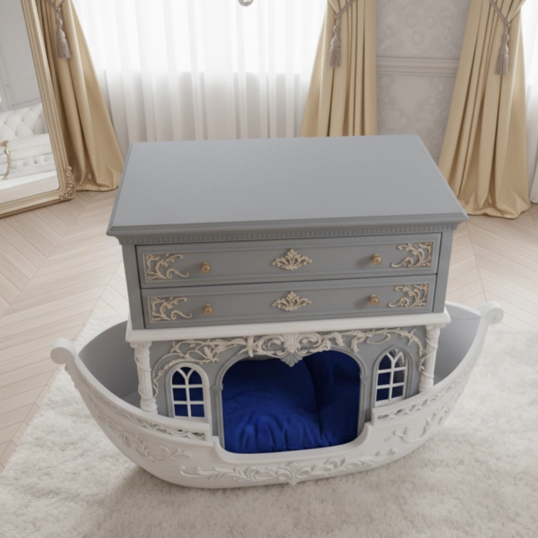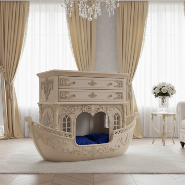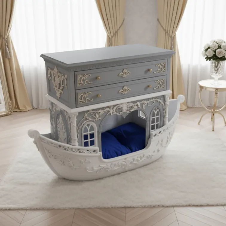 Constructed with a reinforced internal frame, the Bespoke Baroque Pet House Chest is engineered to manage the load transfer from the upper drawers to the curved base. The storage section features dovetail joinery and heavy-duty runners, ensuring smooth operation even when fully loaded. The lower sanctuary is lined with architectural-grade foam and upholstered in high-Martindale velvet, selected for its resistance to scratching and ease of maintenance. The exterior reliefs are hand-carved and finished in a multi-stage lacquer process to ensure durability.