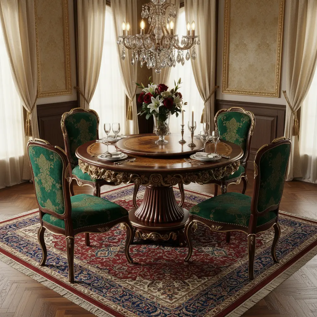 - The Pedestal Architecture: The table base abandons four-leg interference in favour of a central Fluted Column, maximizing legroom. The apron is adorned with high-relief rose garlands, highlighted in Champagne Gold to articulate the rim.