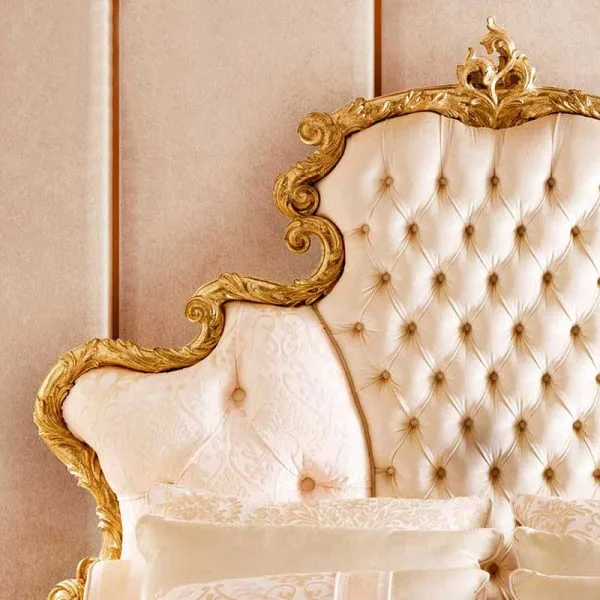 The frame is constructed from kiln-dried solid hardwood, necessary to support the weight of the elaborate cresting and the mattress load. The headboard upholstery utilises deep-button tufting (Capitonné), anchored directly into the frame to ensure tension longevity. The gold detailing is applied by hand to the carved relief work, highlighting the depth of the acanthus leaves and floral motifs. The footboard structure is reinforced to prevent racking, supporting the side rails through heavy-duty metal bracket joinery.