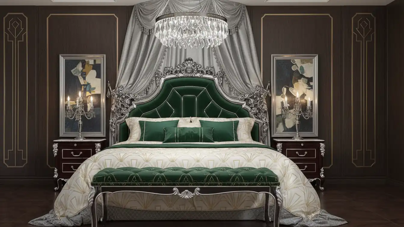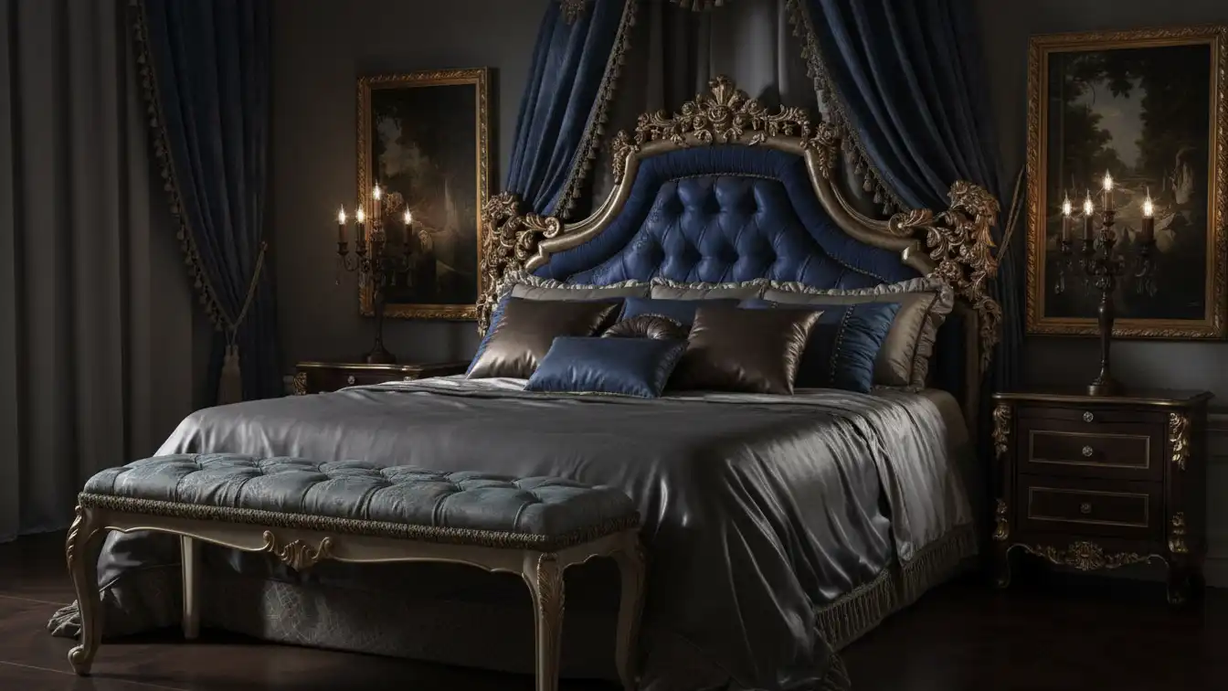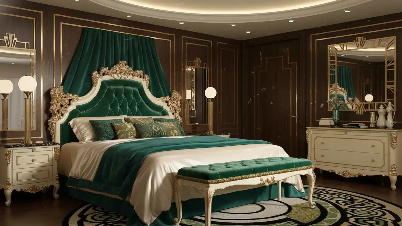 The internal substrate relies on kiln-dried Beech hardwood to support the intricate cantilevered carvings on the headboard wings. Surface finishes are stabilised through a multi-stage lacquering process that seals the gold leaf against oxidation.