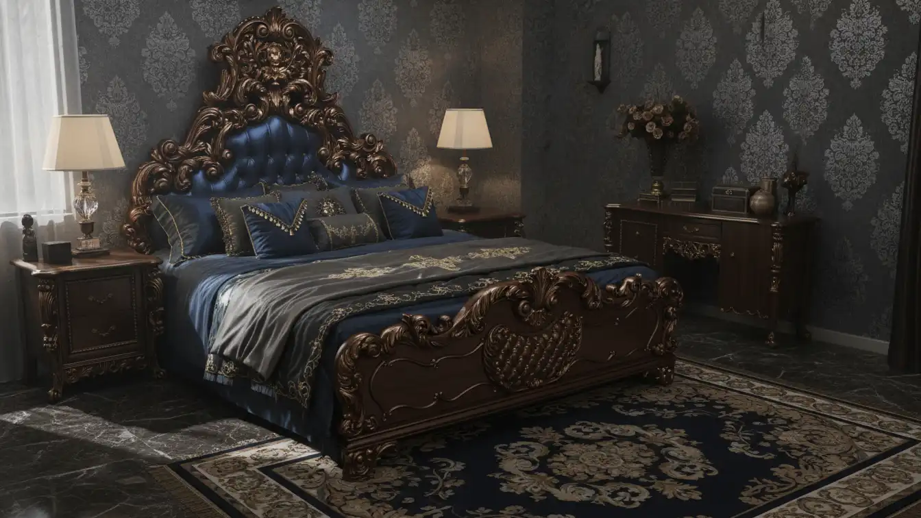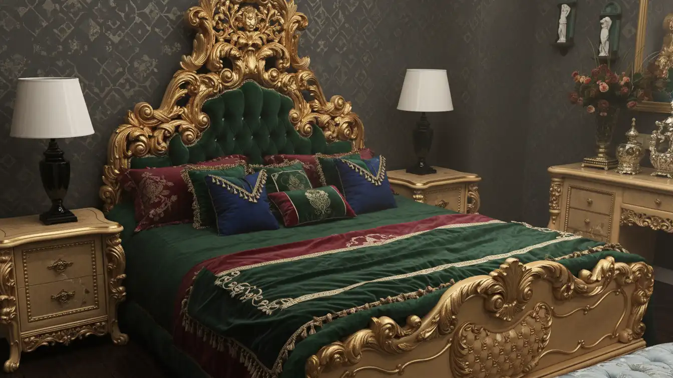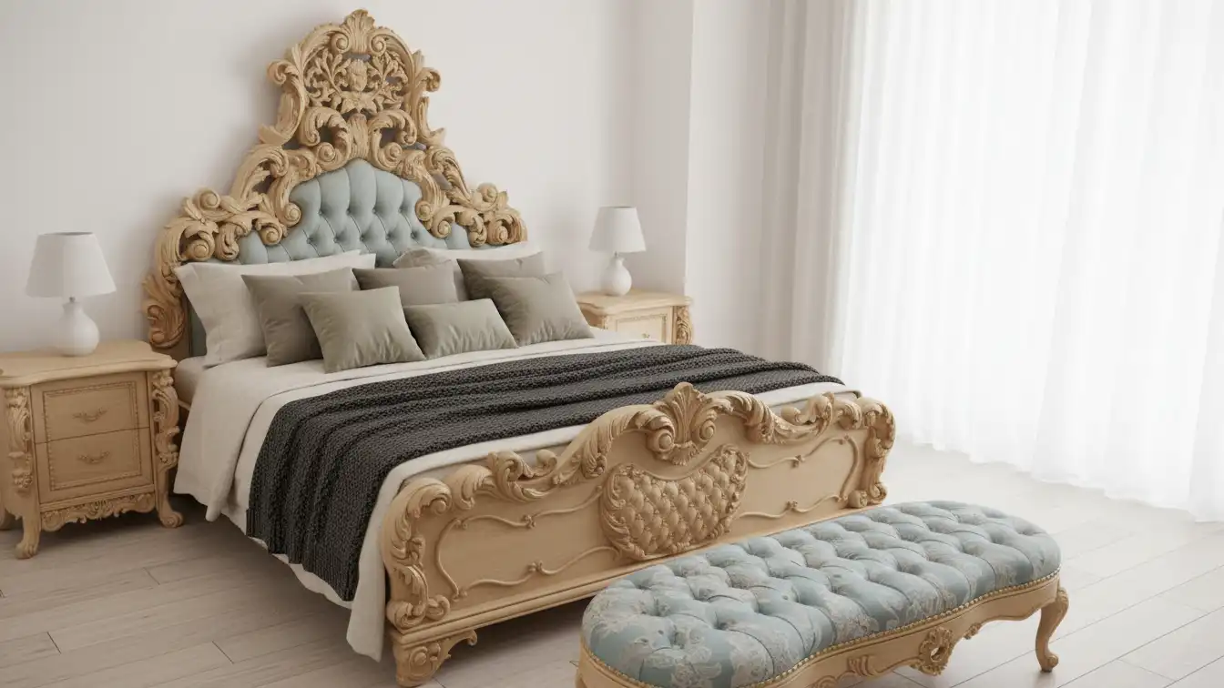 Architecturally, the Antique Gold Baroque Bed with Teal Tufted Headboard resolves its massing through a towering triangular silhouette supported by robust cabriole pillars. Structural load is distributed through a reinforced mortise-and-tenon frame logic, calibrated for luxury residential and hospitality-grade use where the visual weight of the carving is balanced by the engineering of the base.