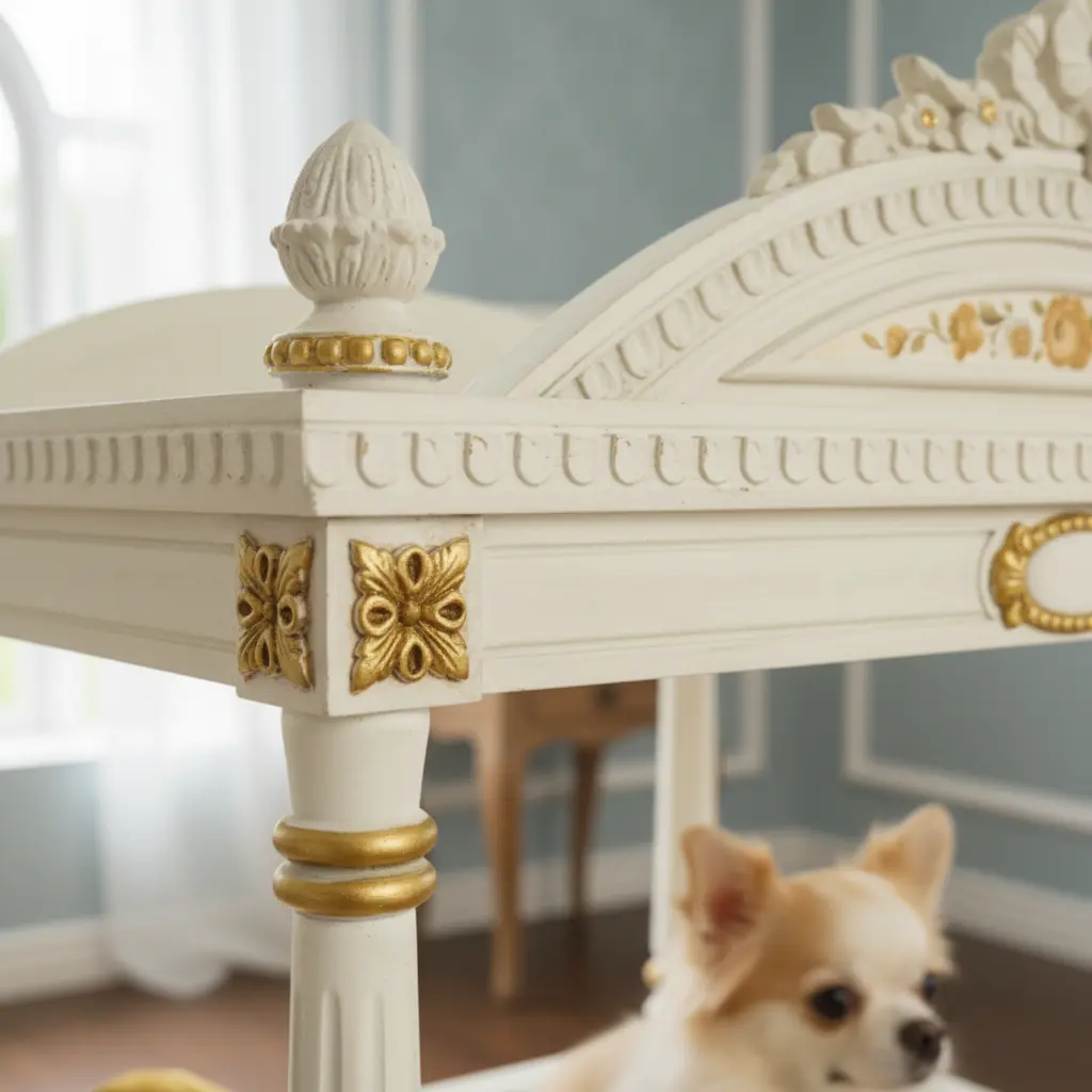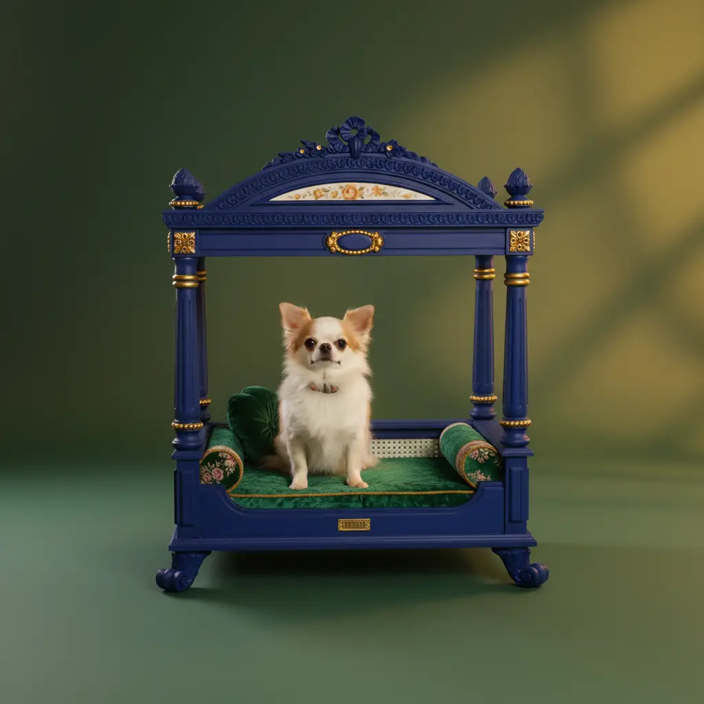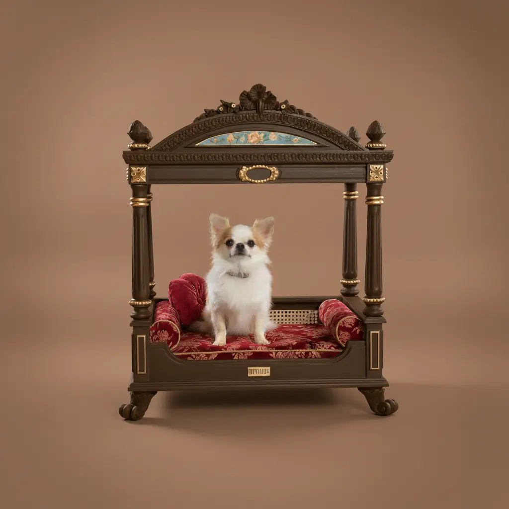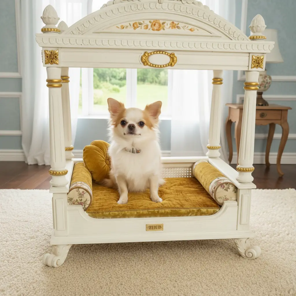 This piece features a Regal and Hand-Carved design that seamlessly integrates into luxury interiors, perfect for villas, high-end homes, or boutique pet hotels. The construction utilizes Solid Kiln-Dried Hardwood, selected specifically for its resistance to warping and maximum durability. The upholstery includes high-density foam padding for orthopedic support and is wrapped in easy-to-clean velvet, ensuring a hygienic and comfortable sleep environment for your cherished companion.