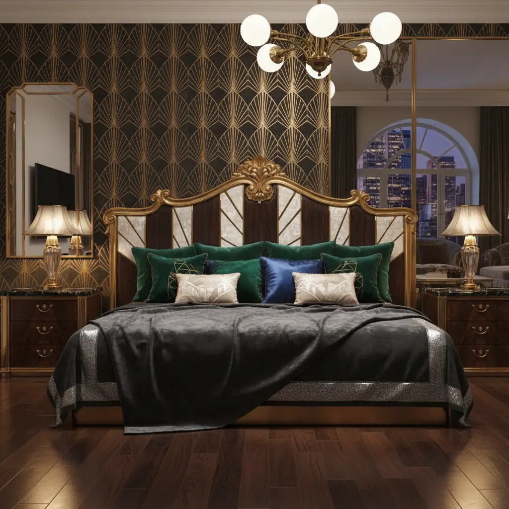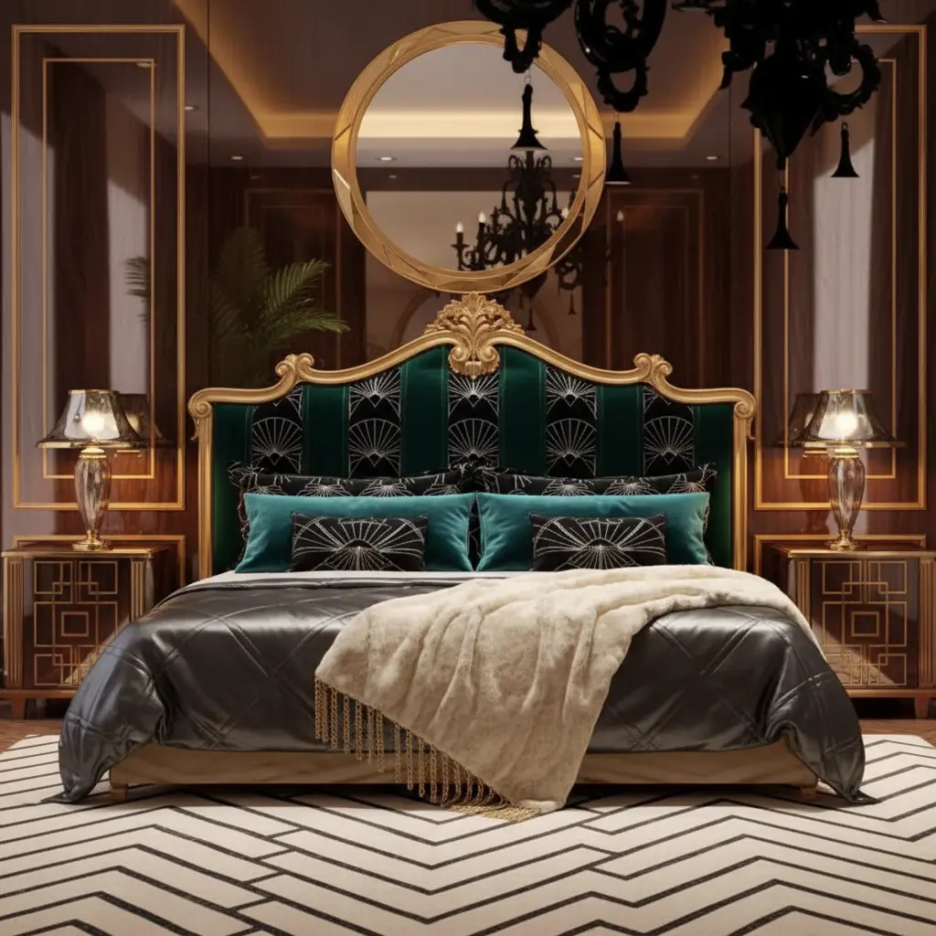The Bespoke Gilded Striped Satin Bed Manufacturer acts as the chromatic anchor for the master suite. Due to the high activity of the headboard pattern, we recommend pairing this piece with neutral wall treatments (e.g., matte grey or off-white plaster) to maintain visual hierarchy. The cylindrical nightstands should be positioned 100mm from the bed frame to allow the gold leaf detailing of the side wings to be fully visible.