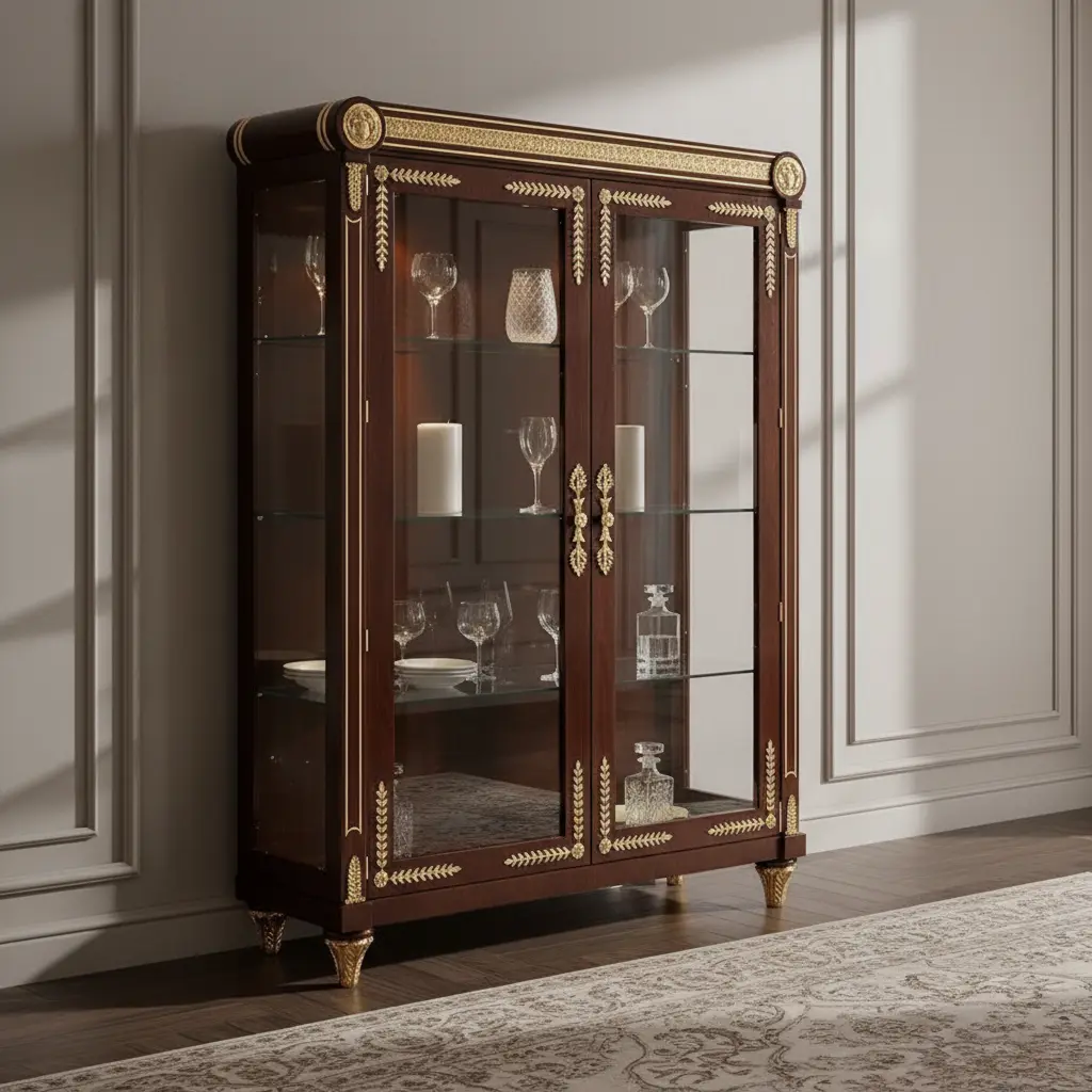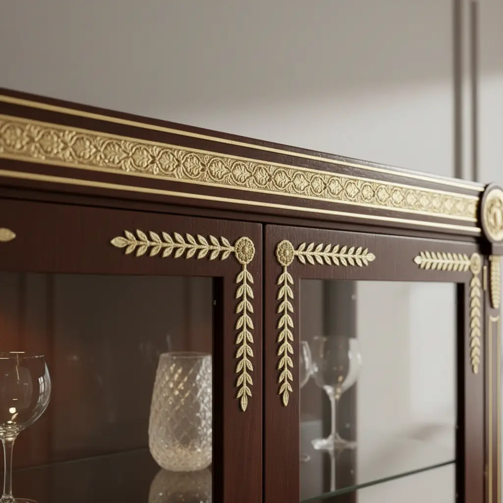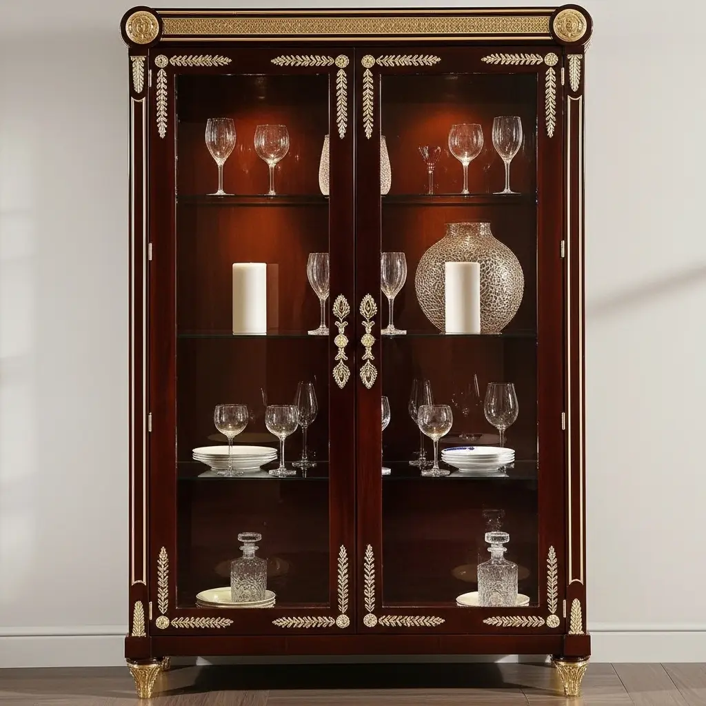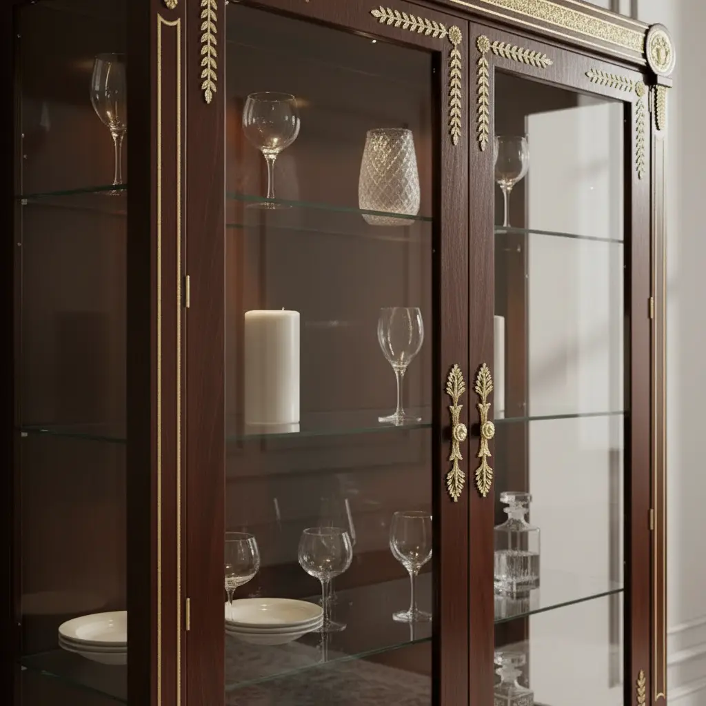 The structural frame relies on a warp-resistant engineered core, essential for maintaining the alignment of the tall glass doors over decades. The glazing is strictly 6mm tempered architectural glass, secured with vibration-dampening gaskets to prevent rattling. The gold details are finished with an antioxidant coating, ensuring the metallic brilliance remains tarnished-free even in humid environments.